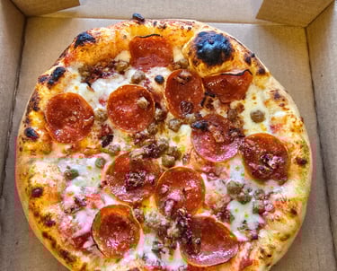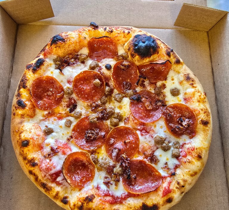 A hearty mix of pepperoni, sausage, bacon and mozzarella on a marinara base