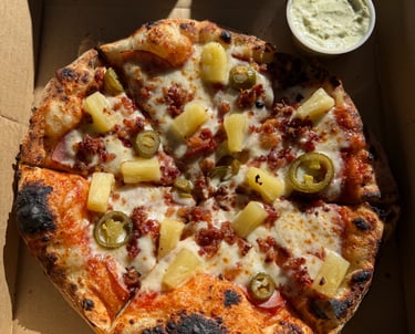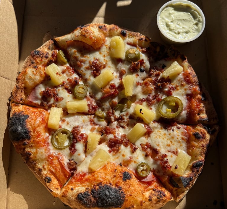 Marinara, mozzarella, pineapple, Canadian bacon, and bacon